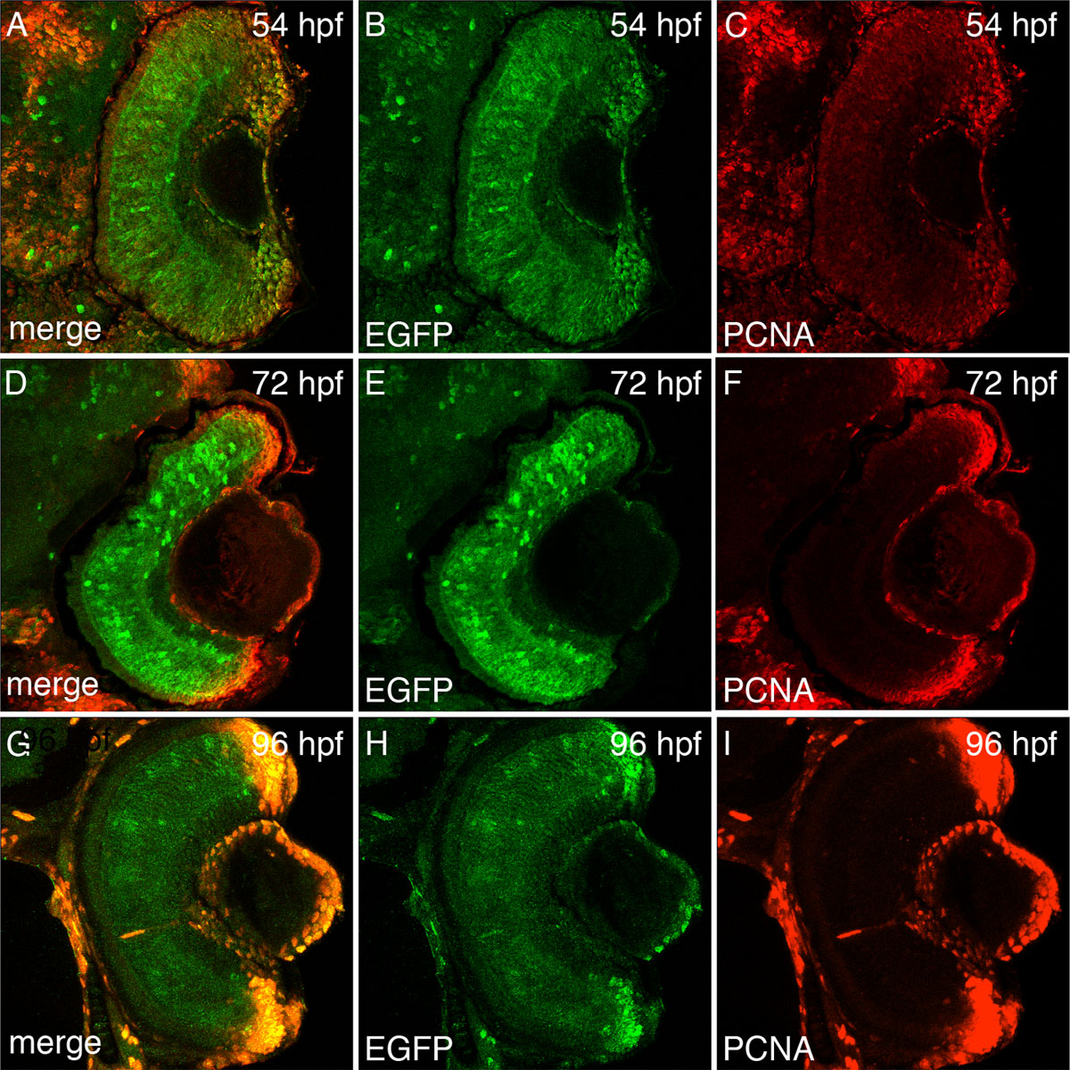 96 hpf of retinal development. At 54 hpf, EGFP is expressed throughout