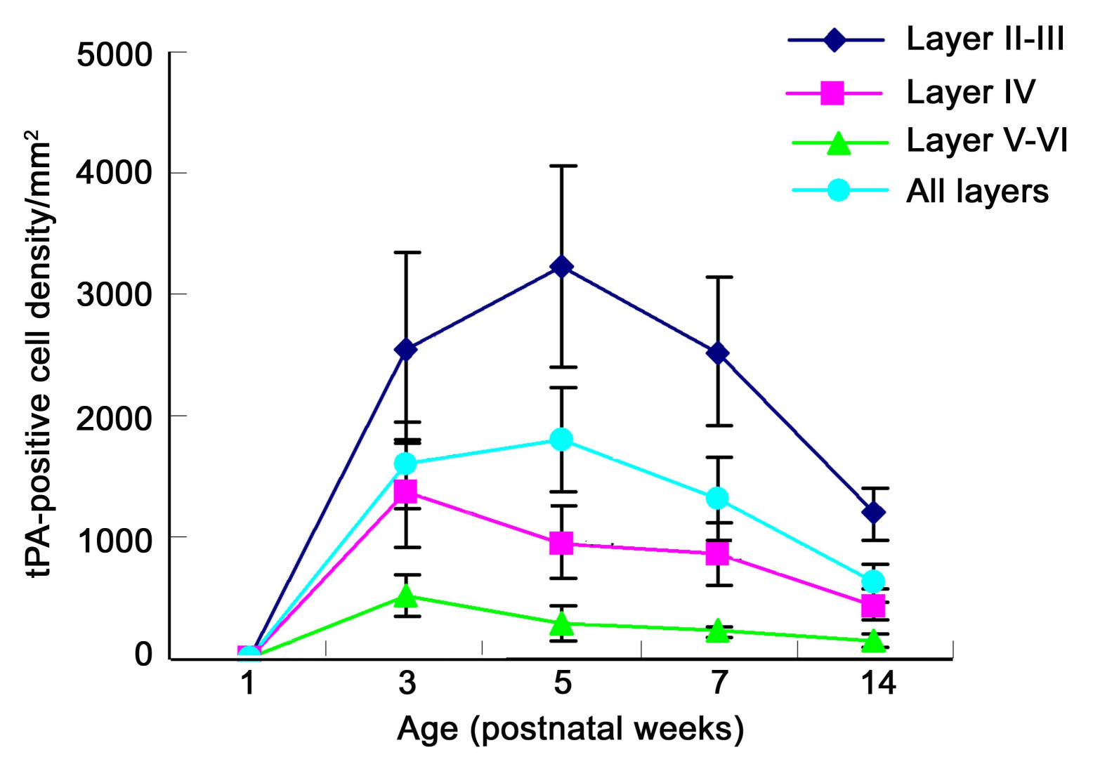 respectively. Note that in layer IV the density of tPA labeled cells