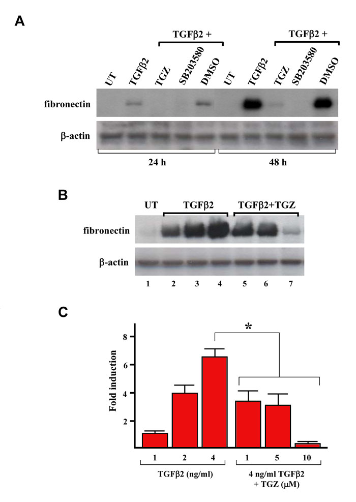 in triplicate with β-actin as loading control. B: Dose study of the effect of TGZ on TGFβ2-induced fibronectin expression.