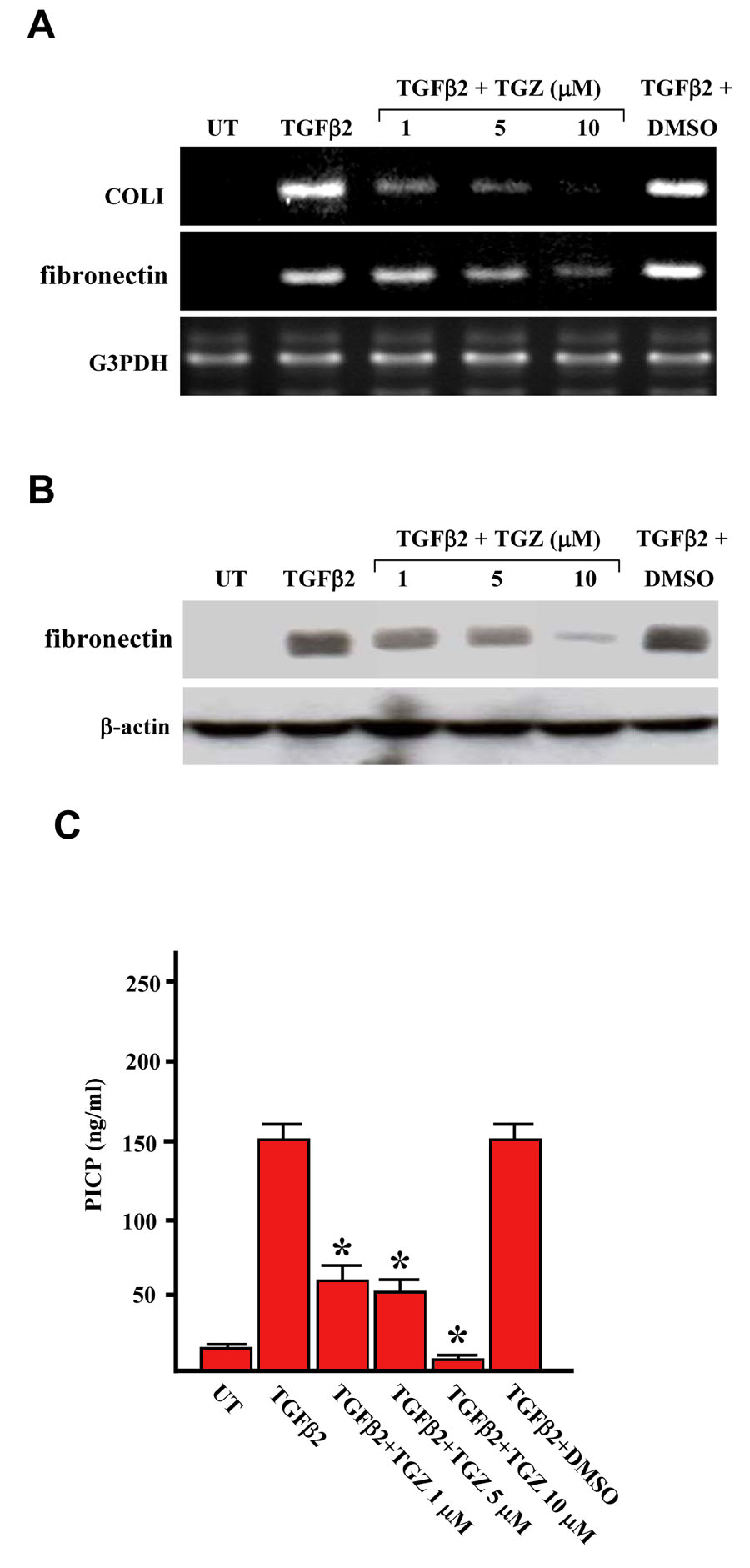 with different doses of TGZ (1, 5, 10 μM; 1 h) or DMSO (0.05%, 1 h) and then incubated with TGFβ2. The expressions of fibronectin