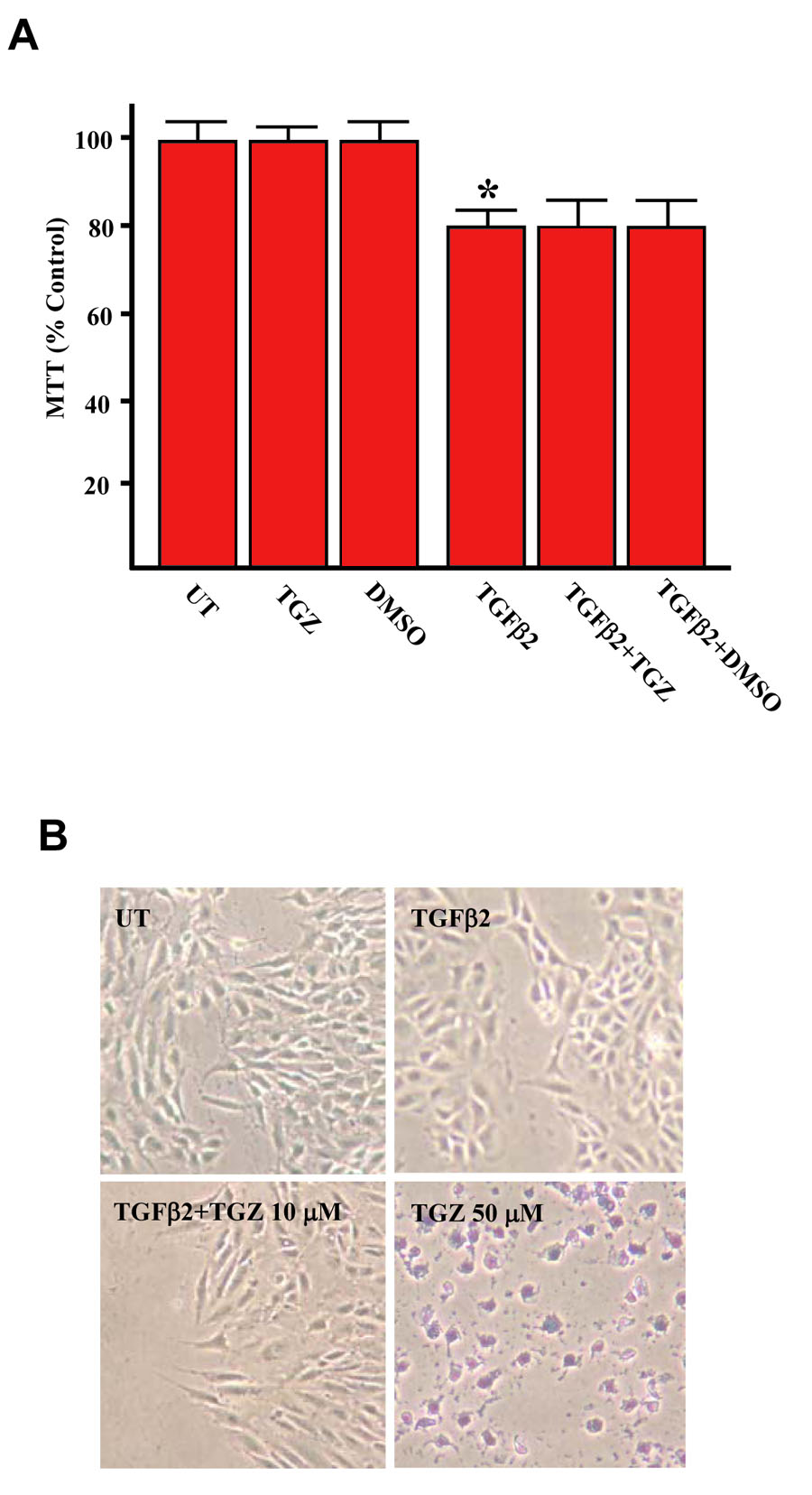 (B). TGZ at 50 μM is cytotoxic and used as positive control of trypan blue exclusion assay. Bars represent the mean ± SD *p<0.05