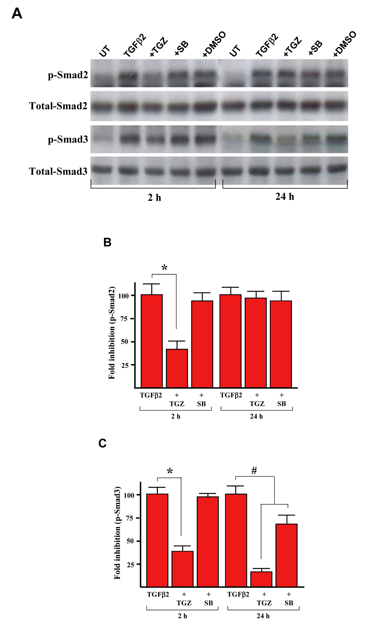 or were pretreated with 10 μM TGZ, 10 μM SB203580, or DMSO for 1 h and then stimulated with TGFβ2 for the indicated time periods.