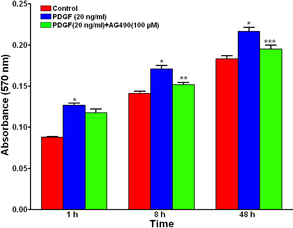 PDGF in the presence or absence of JAK2-STAT3 inhibitor, AG-490, for 1
