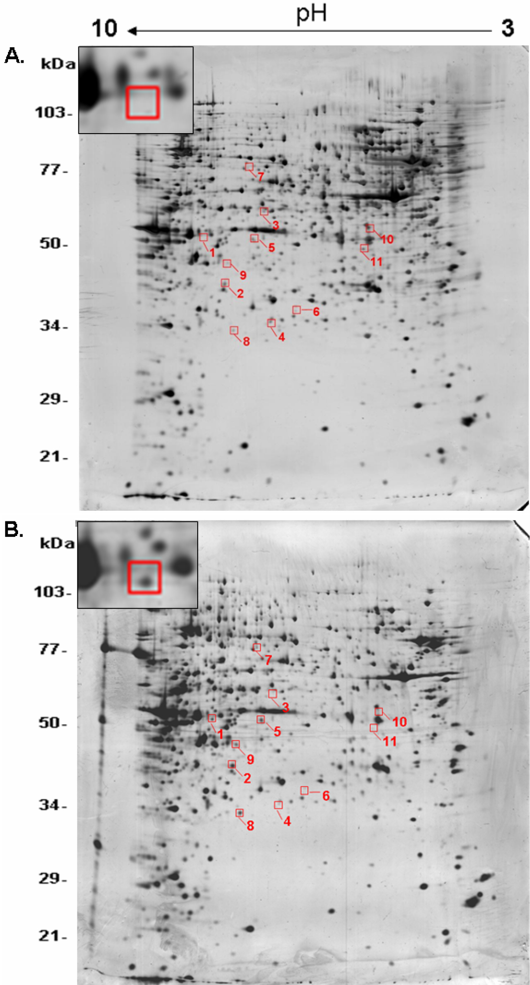 58.6 kDa, pI 6.43). The expanded regions of differentially expressed