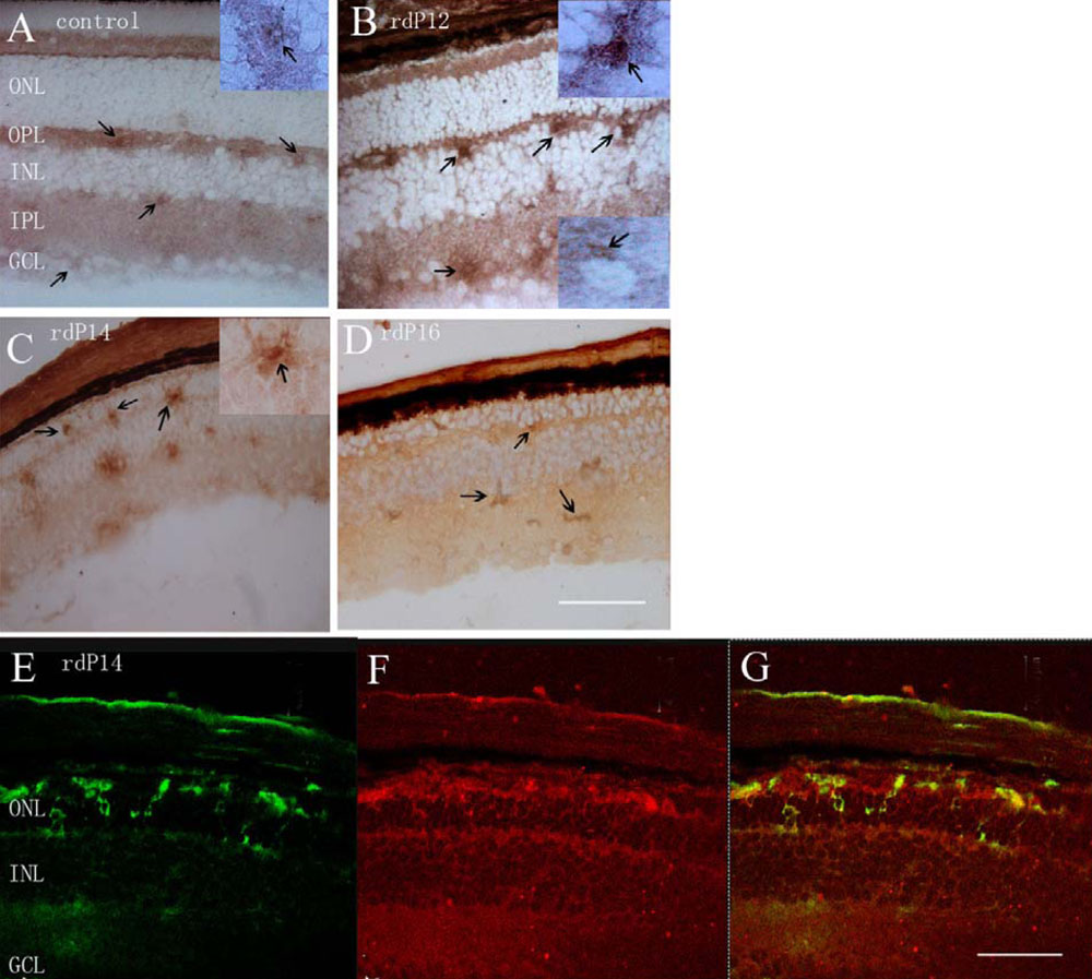 co-localization of NF-κB in microglial cells in the outer retina. E: