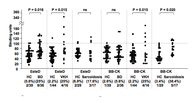p=0.015) for anti-EsteD antibody, and in VKH (p=0.015) and sarcoidosis