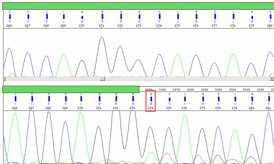 sequences between the unaffected (top: I-2) and the affected (bottom: