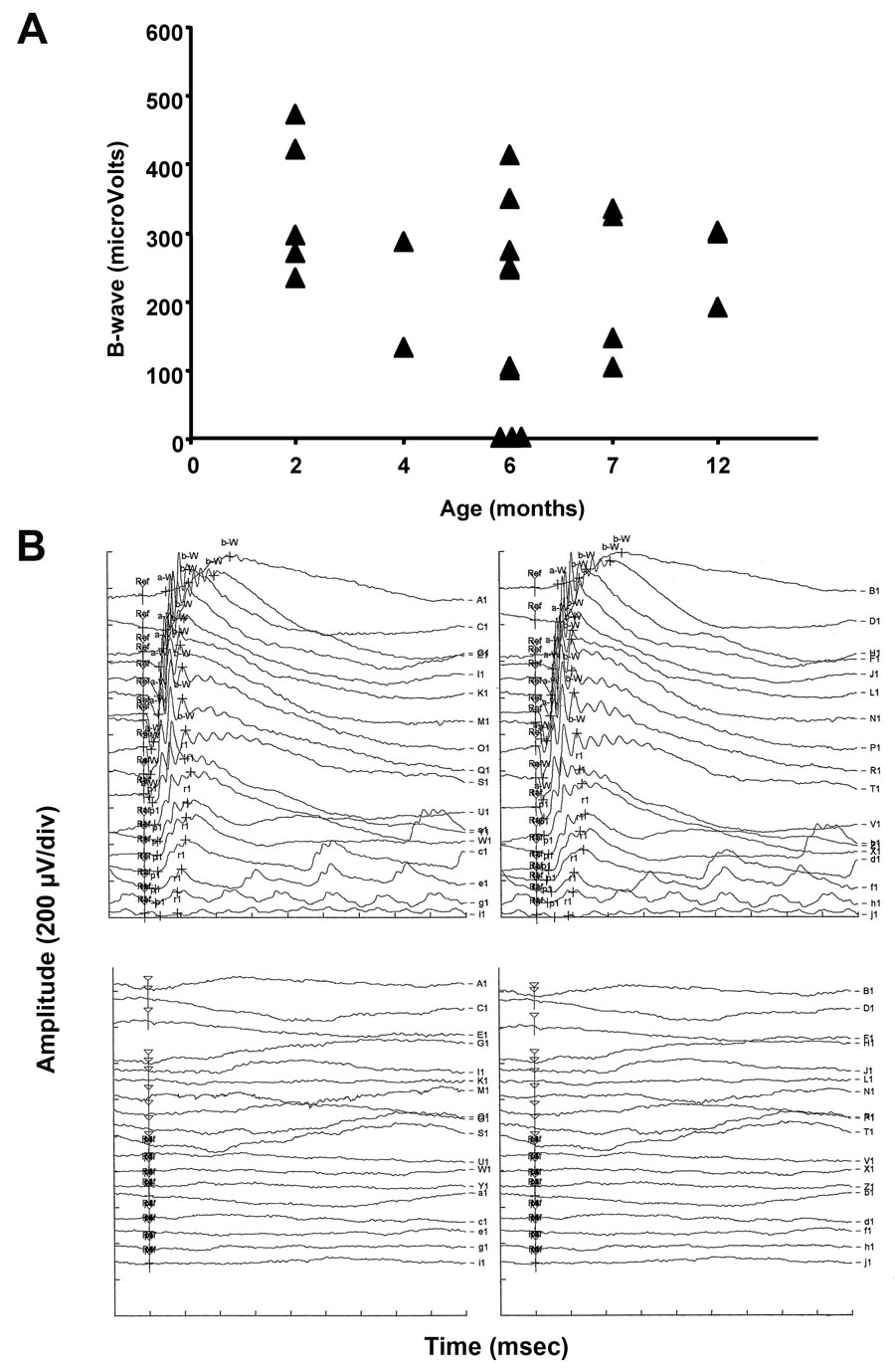 transgenic mice at various ages. A: Amplitudes of b-waves of