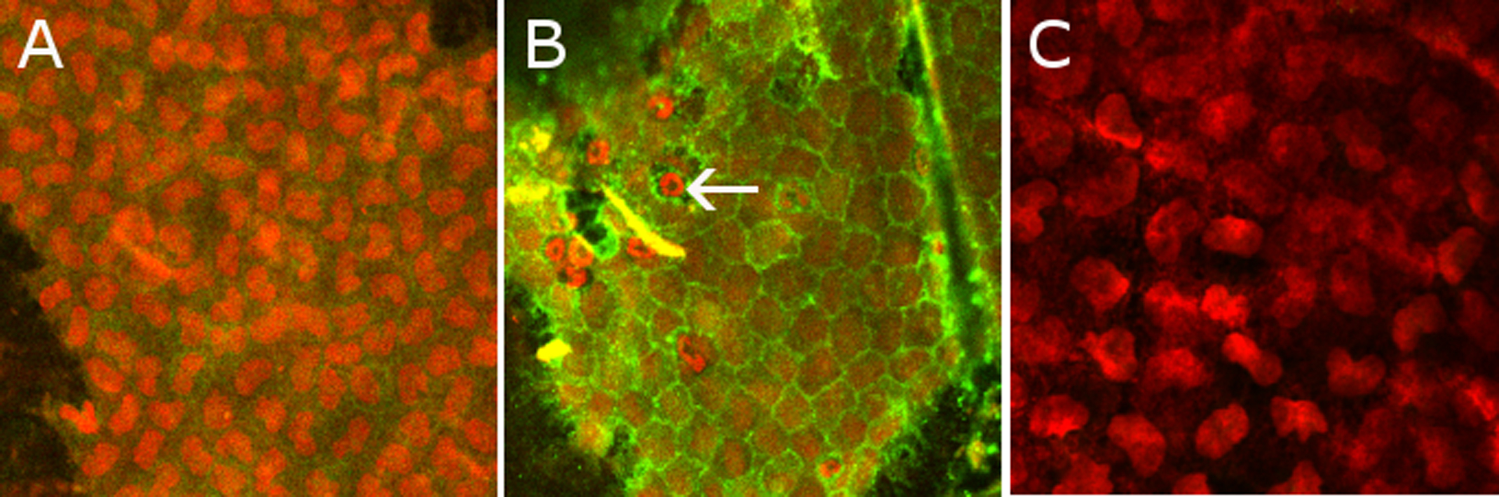 anti-CD54 ICAM-1 (in green) and with propidium iodide (in red) on