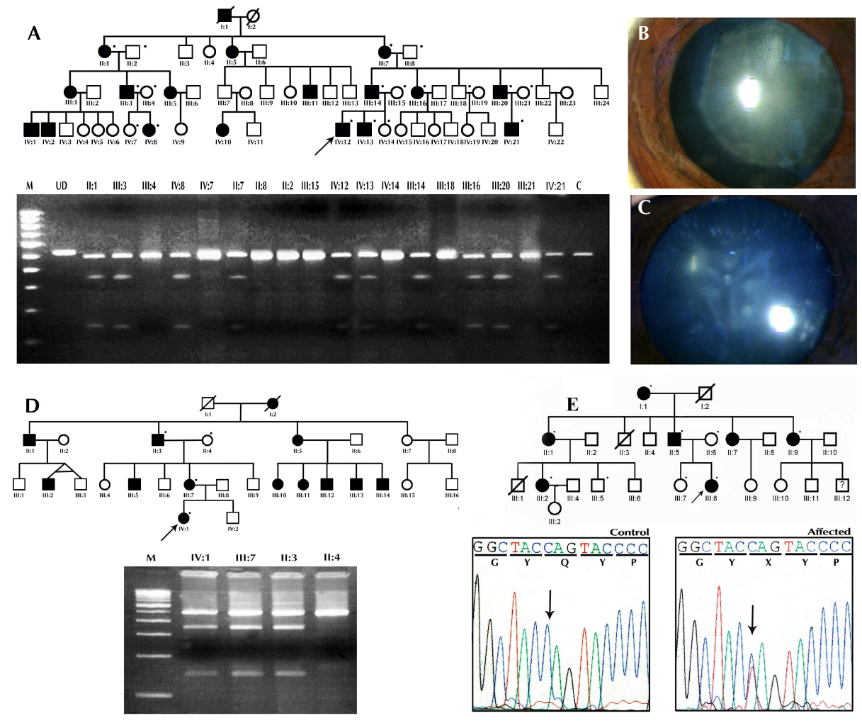 with lamellar cataract (B) and individual III:20 aged 33 years (C),