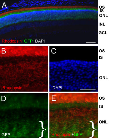 rhodopsin fluorescence in the ONL is not detectable. Bar=50 μm. B-E.