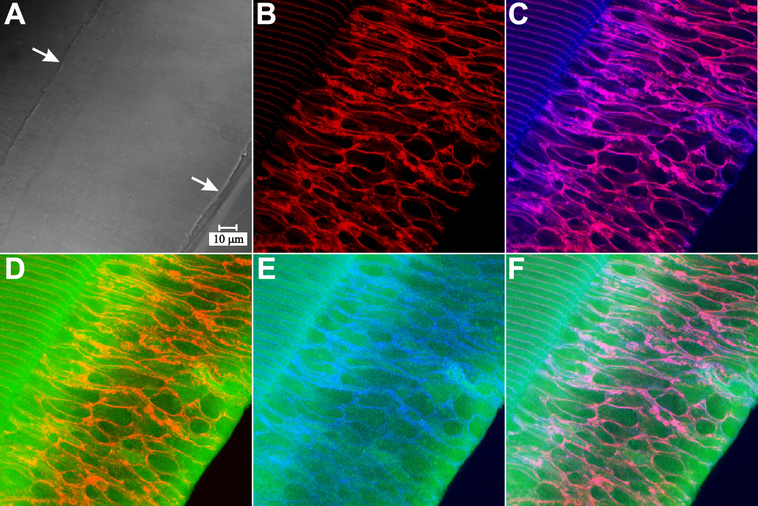 Actin immuno-fluorescence (red) delineates the fiber end profiles,