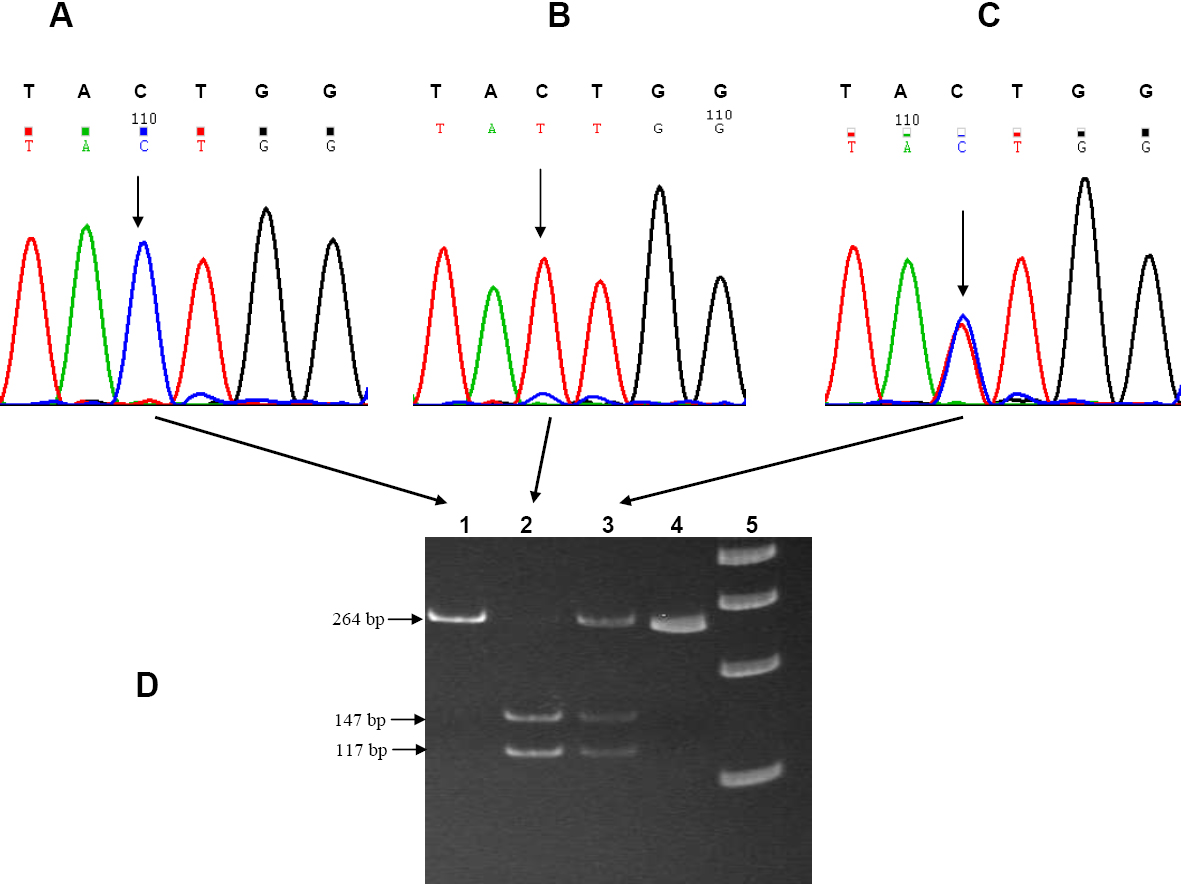 exhibited all three fragments (264 bp, 147 bp, and 117 bp). Lane 4
