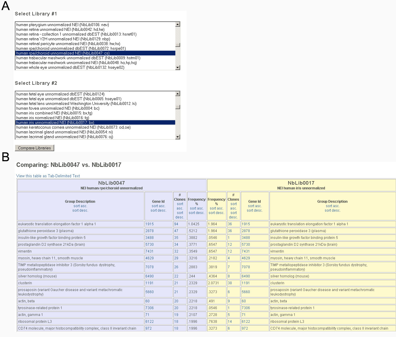 EST data for pairs of cDNA libraries can be selected for comparison. B: