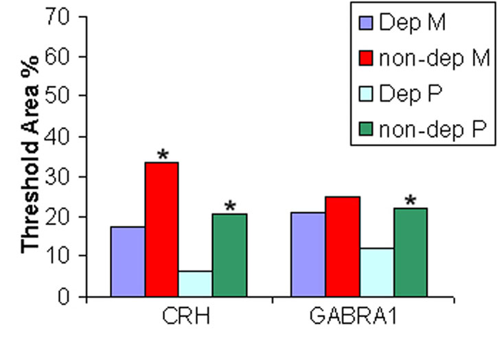hybridization of CRH and GABRA1 in deprived LGN. Percent threshold area