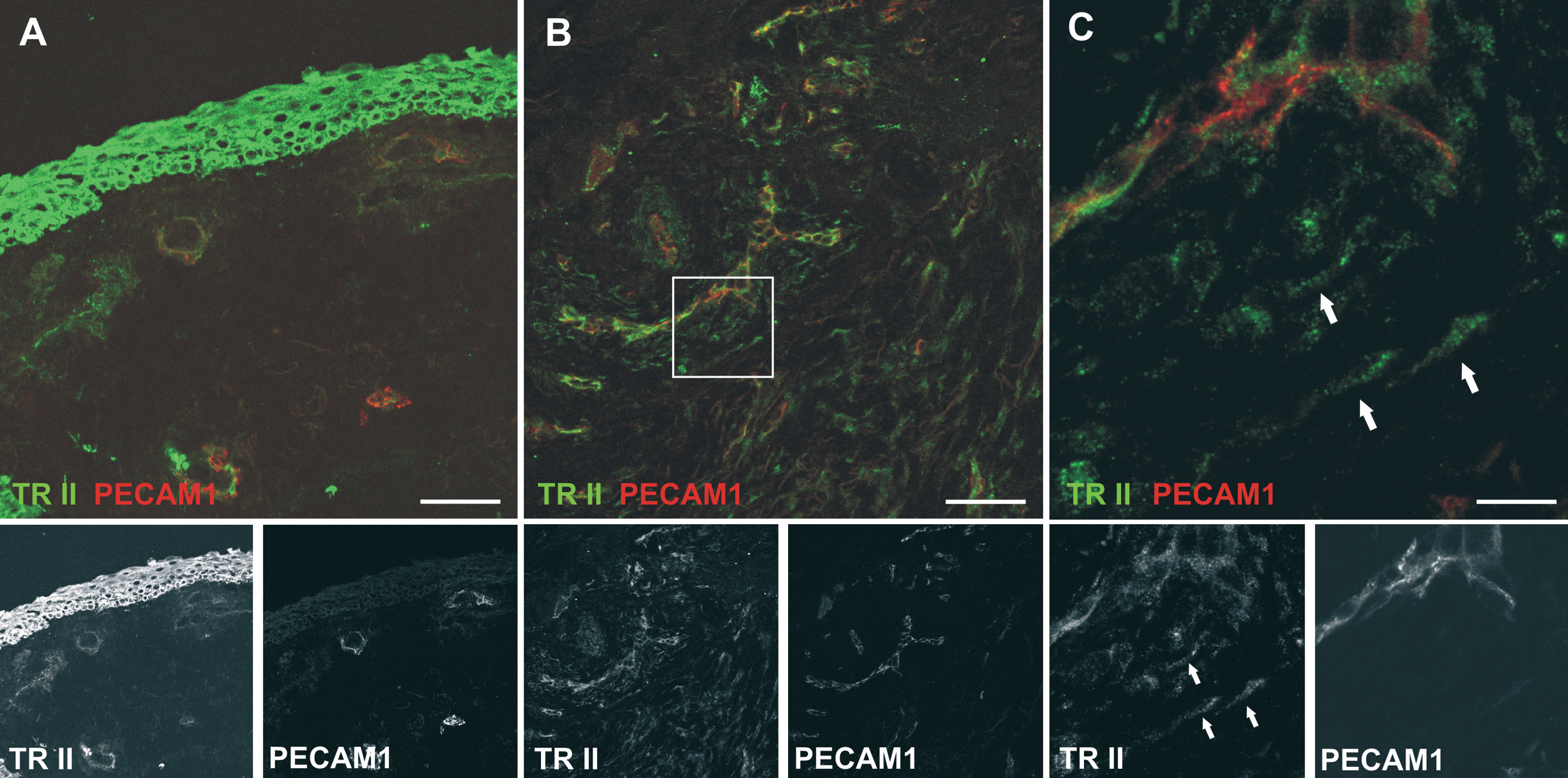 Arrows point to elongated TGF-β-RII positive cells devoid of PECAM-1