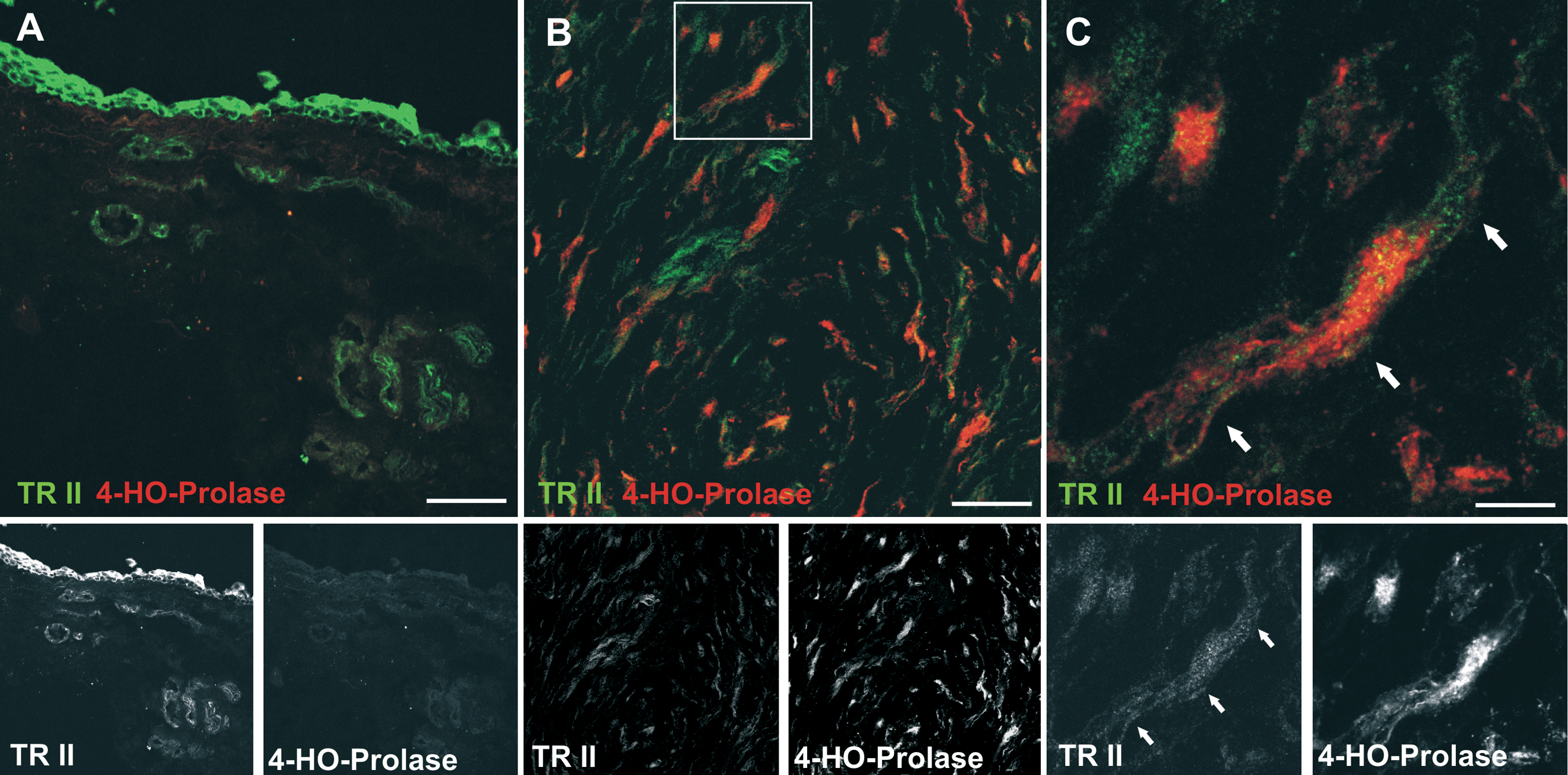 both TGF-β-RII and prolyl-4-hydroxylase. Scale bar represents 50 µm (A,B)