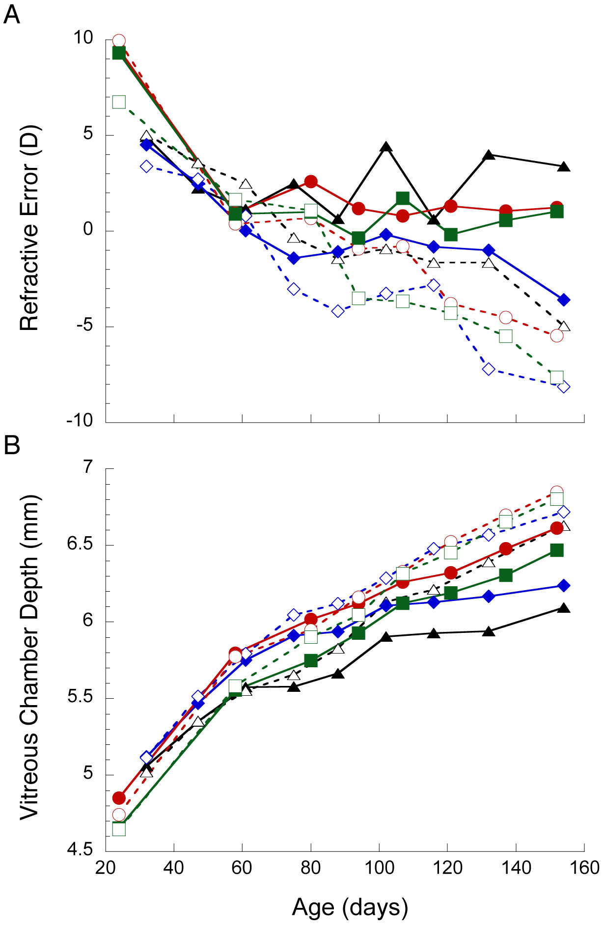contralateral +5 D lens-treated eyes (closed symbols). B: −5 D