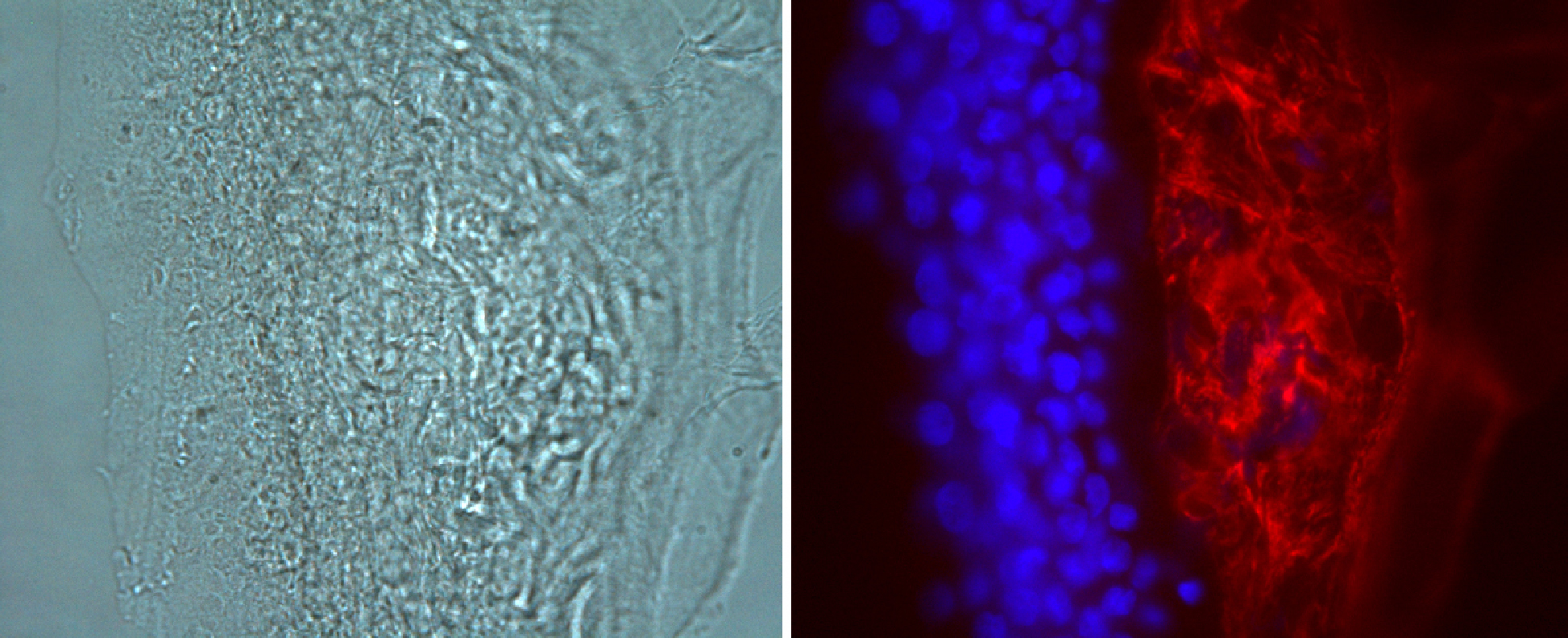 epithelial nuclei are stained with DAPI (blue). The right hand image