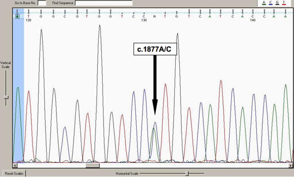 Electropherogram of TGFBI exon 14 in an affected individual. This revealed a missense transversion A→C at nucleotide 1877, resulting in a substitution of histidine by proline (CAT→CCT, H626P).