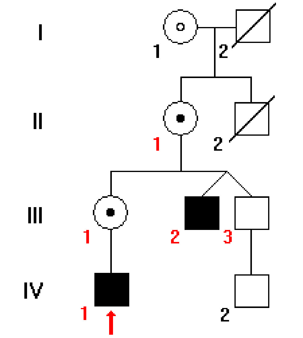 deceased family members. Patients III/2 and III/3 are fraternal twins.