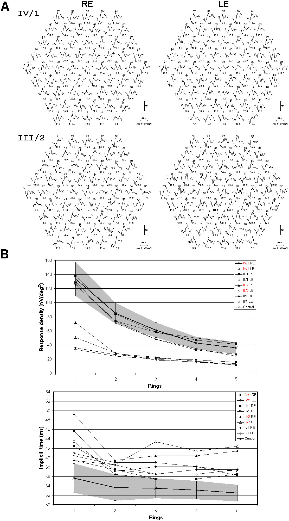 densities (RDs) and implicit times of multifocal electroretinographs