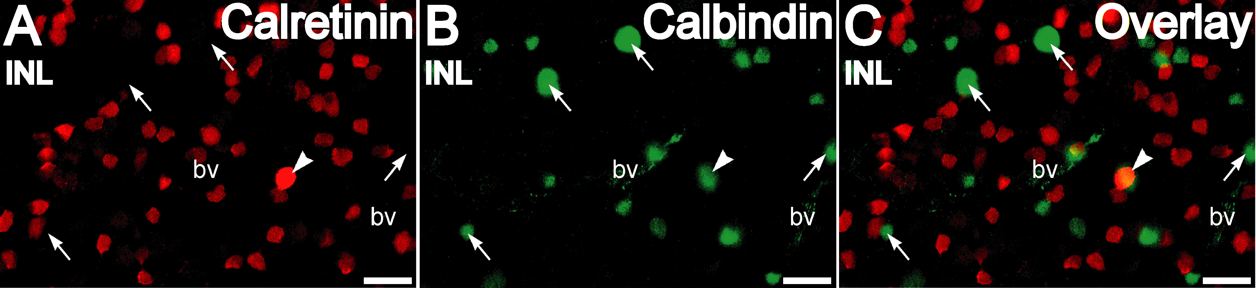 calbindin-28 kDa (green) in the inner nuclear layer shows that labeling
