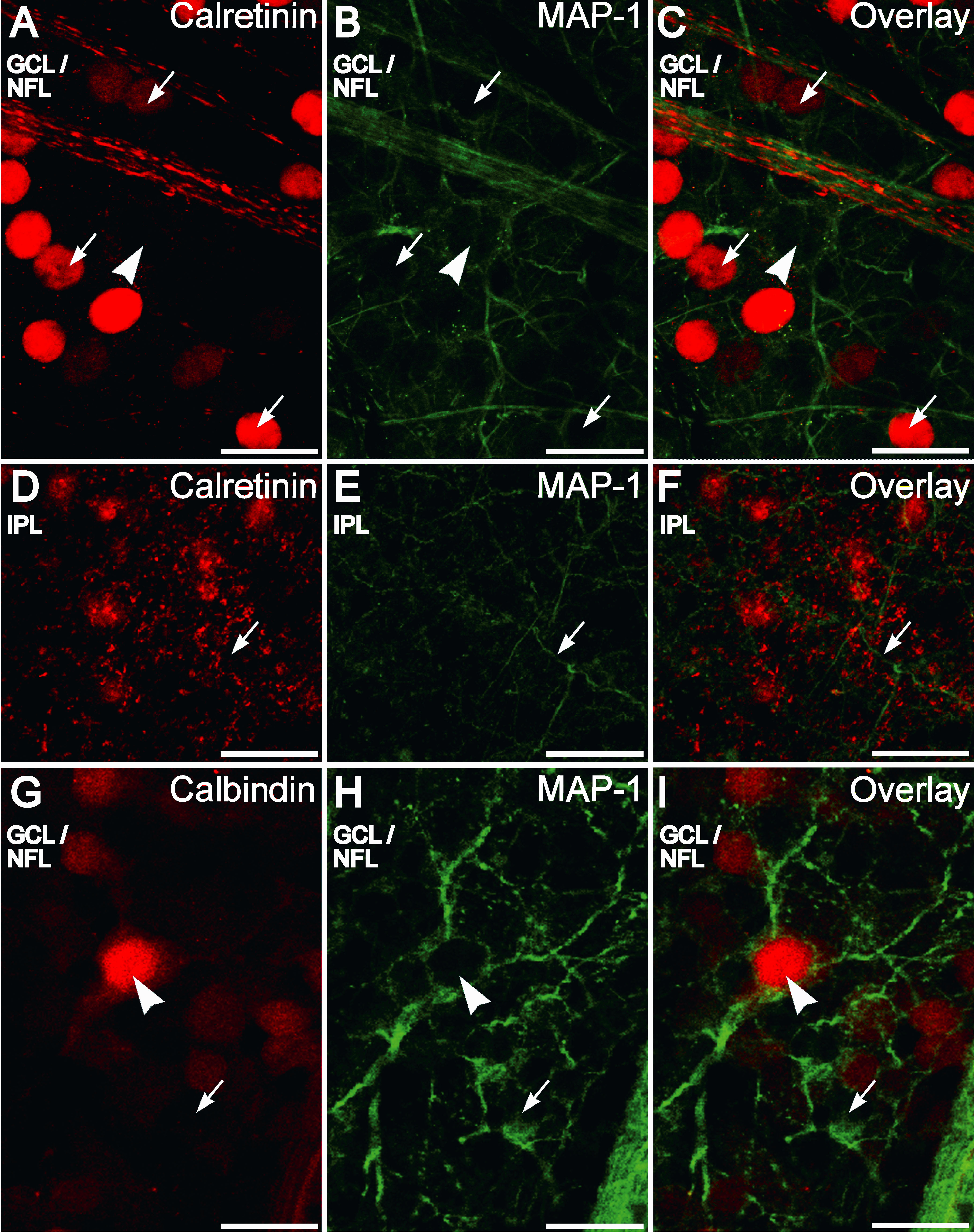 1 (MAP-1; green) in the ganglion cell layer (GCL)/nerve fiber layer