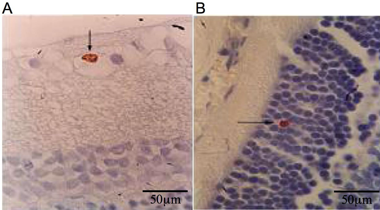 Immunohystochemistry for BrDU in retinal slides from studied rats. The BrDU positive cells, although rare, are localized in ganglion cell layer