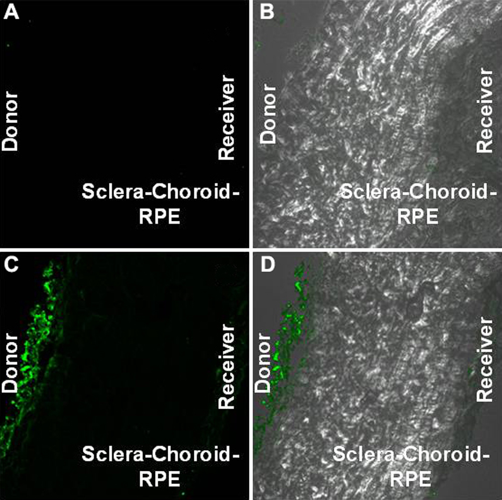 Figure 3. Confocal images of the sclera-choroid-RPE combination at the end of 24 h nanoparticle (20 nm) transport study. Panel A shows the fluorescence image and Panel B shows the combination (fluorescence plus phase contrast) image of the control sclera-choroid-RPE tissue. Panel C shows the fluorescence and Panel D shows the combination (fluorescence plus phase contrast) image of the sclera-choroid-RPE tissue that was exposed to nanoparticles
