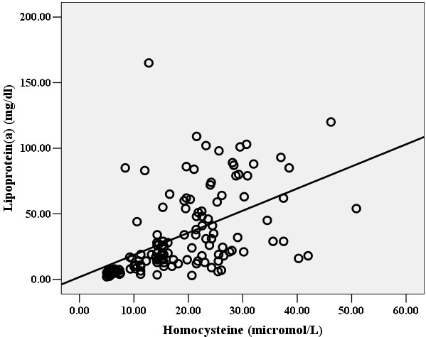 Correlation of Hcy level with Lp(a) level. There was a direct linear correlation between Hcy and Lp(a) levels in the study population (r=0.67, p<0.01), i.e., higher level of Hcy was associated with higher level of Lp(a).
