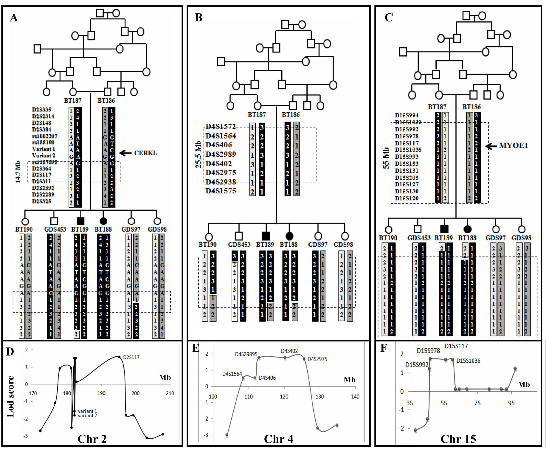 Chromosome 2, 4, and 15. Lod scores for the different markers studied