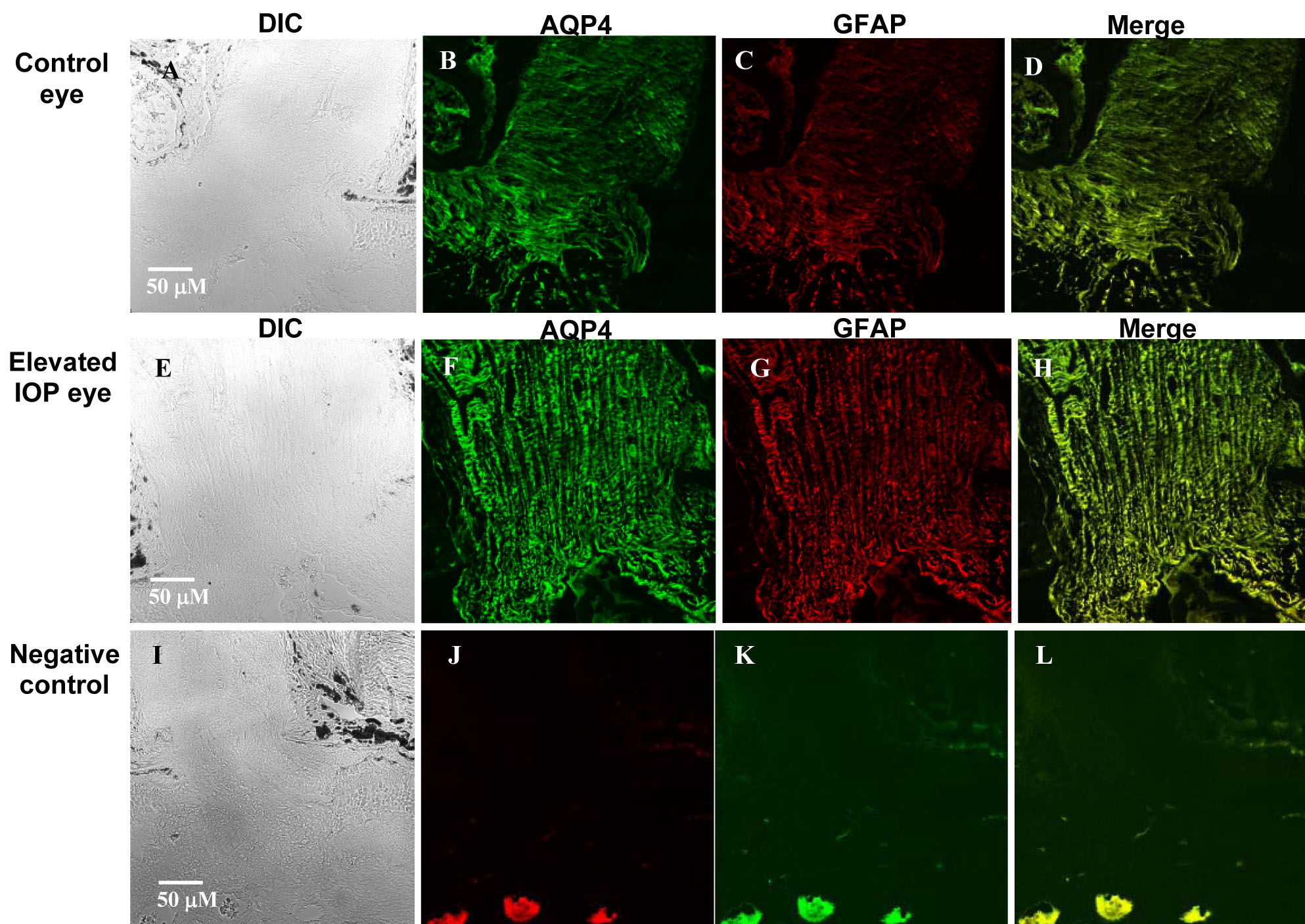 contralateral (control) eyes showed modest AQP4 and GFAP expression (