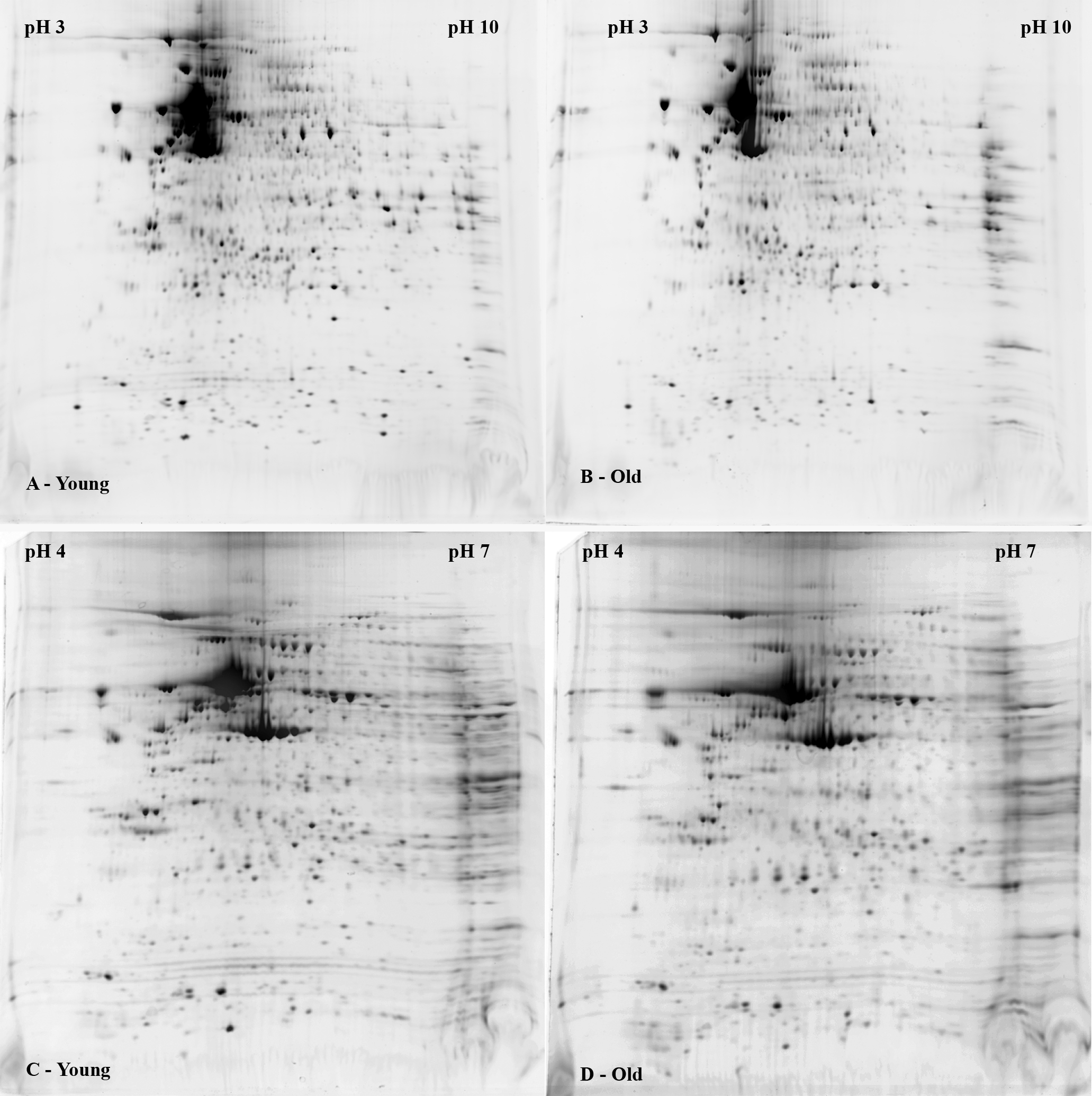 or pH 4–7 IPG strips (C,D) followed by separation on