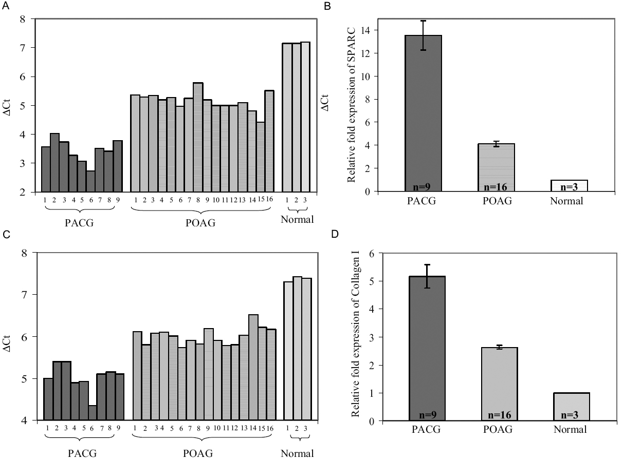 subjects. B: Fold expression of SPARC mRNA in PACG and POAG