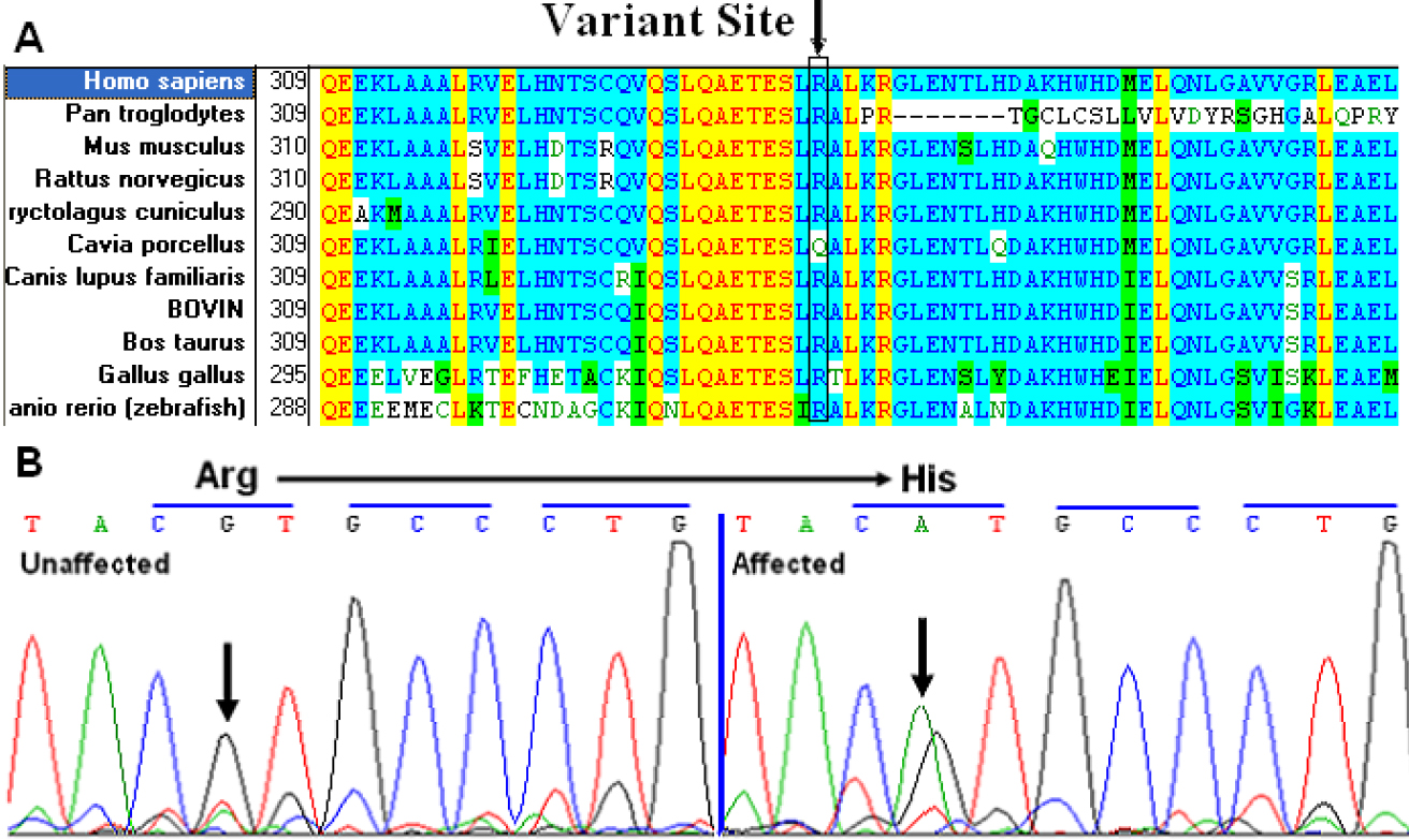 sequence chromatograms of the P.R339H mutation in BFSP2 are