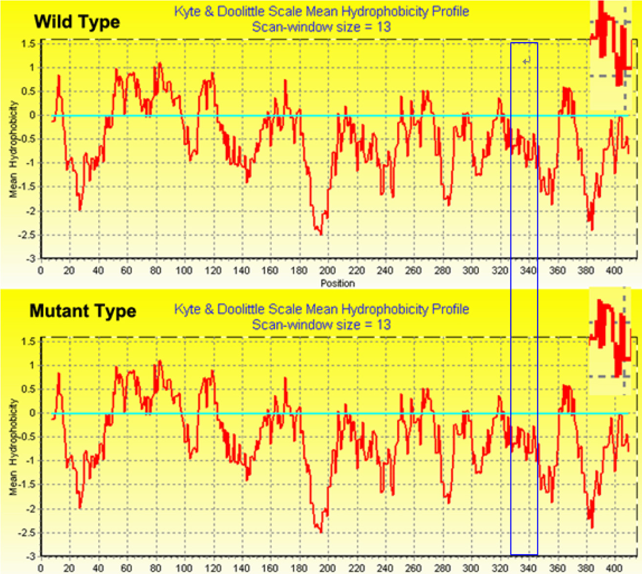 hydrophobicity. Hydrophobicity of the mutant protein increased between