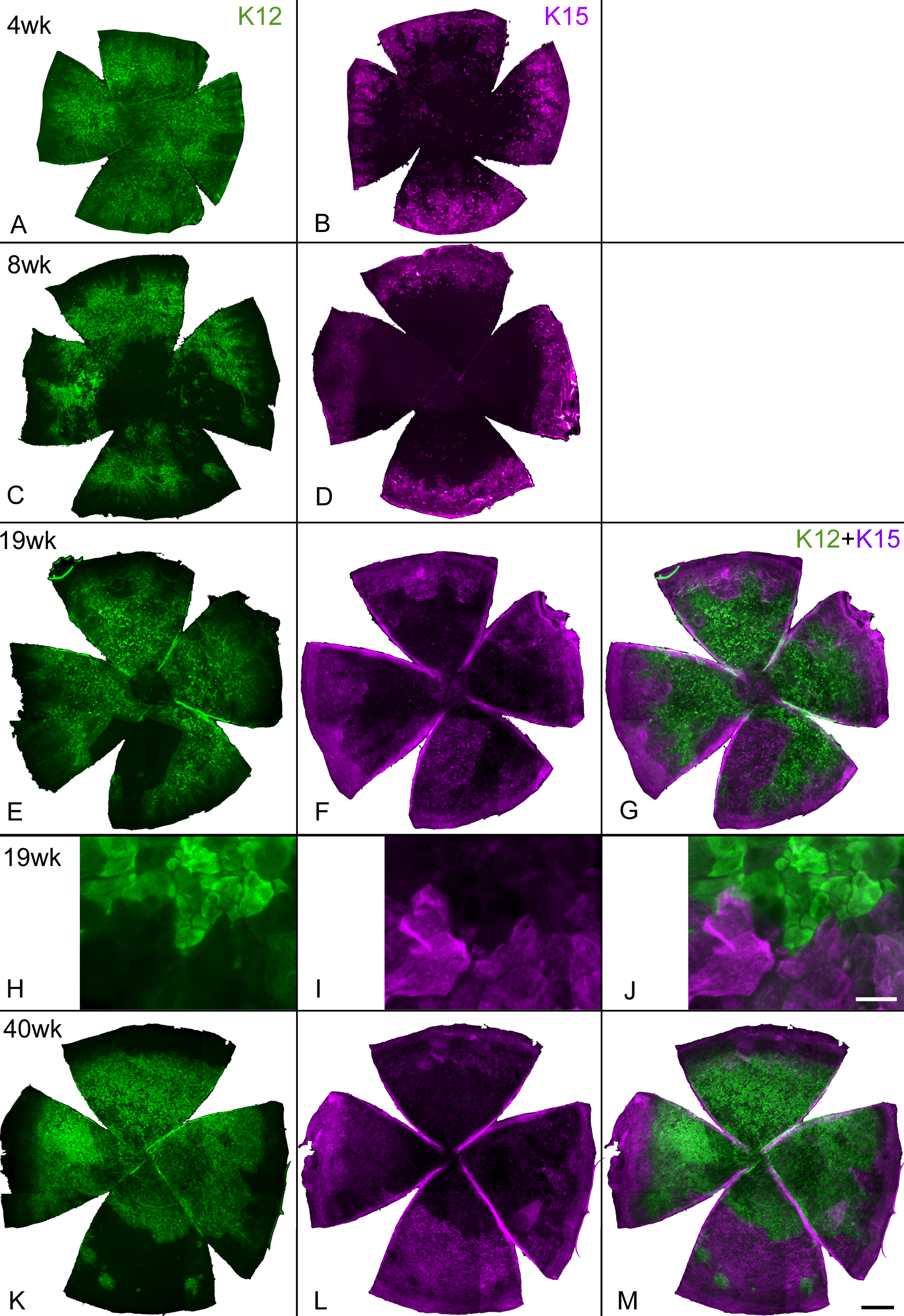 purple) at indicated ages. Only the cornea is shown. K12 patterns