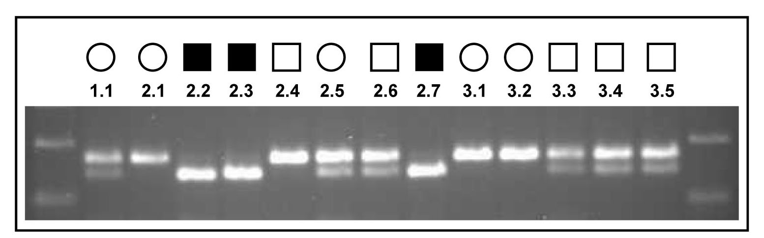 mutation. Ultraviolet illuminated agarose gel presents BsaWI-digested