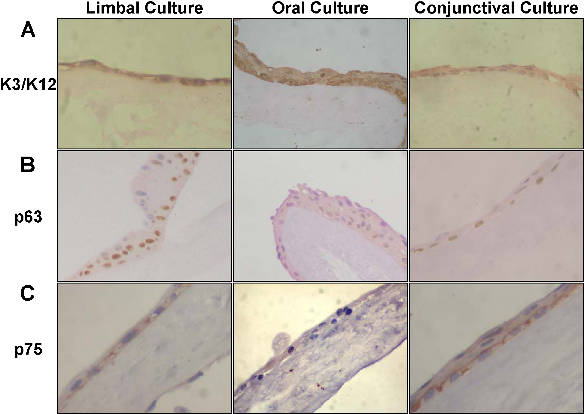 K3/K12, p63 and p75 in limbal, oral and conjunctival cultures.