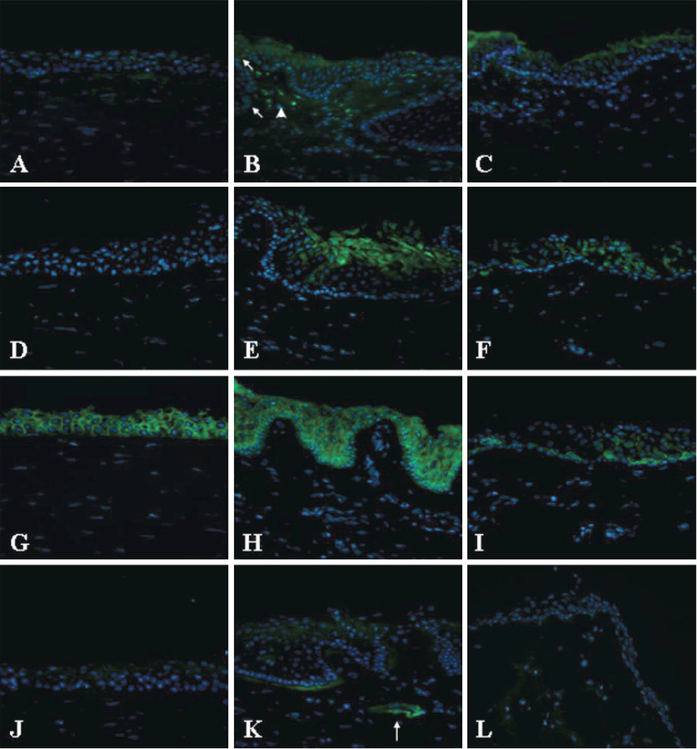 was cornea (A,D,G,F). The middle was limbus (B,E,H,K), and the right was conjunctiva (C,F,I,L). HOP (green, A-C) was localized to the nucleus (blue) of a subgroup of basal limbal epithelial cells (B, arrows) and stromal cells (arrow head). K13 (green, D-F) was expressed in the suprabasal limbal (E) and conjunctival (F) epithelium and absent in the cornea (C). PERP (green, G-I) was localized to all layers of the epithelium in all three tissues. TNC (green, J-L) was localized specifically at the basement membrane of the limbus and blood vessel walls (arrow).