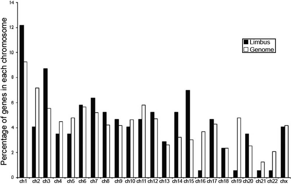 Chromosomal distribution of preferentially overexpressed genes in the limbus was disproportional to that of all other known human genes. Abbreviation: ch, chromosome.