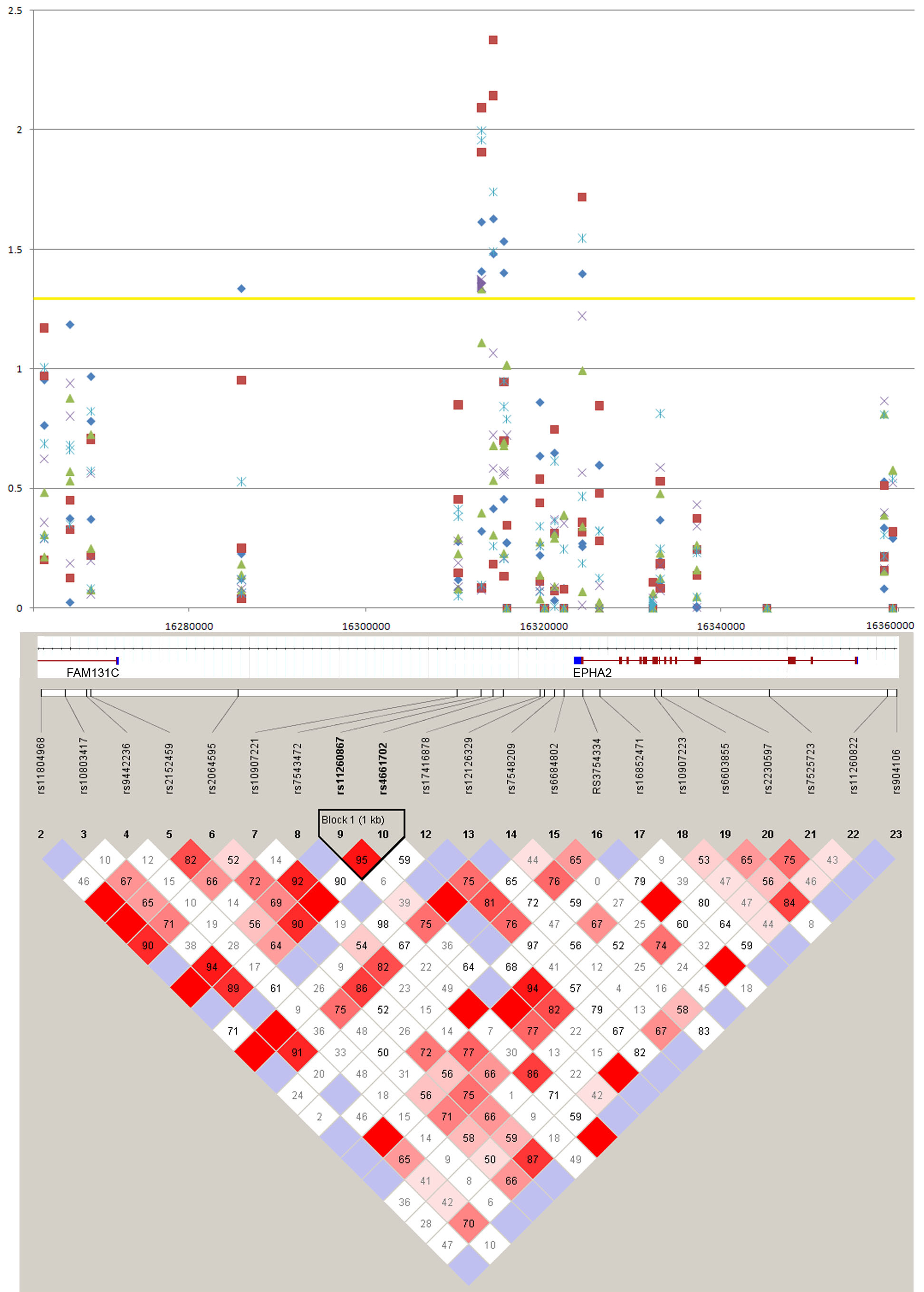 disequilibrium (LD) is color-coded; red indicates strong LD with SNPs