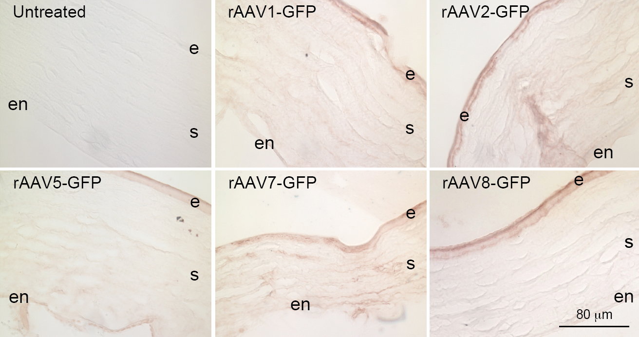 Immunostaining of rabbit corneas for GFP expression delivered by different serotypes of rAAV vectors, using the streptavidin-peroxidase detection system. e, epithelium; s, stroma; en, endothelium. Bar=80 μm.