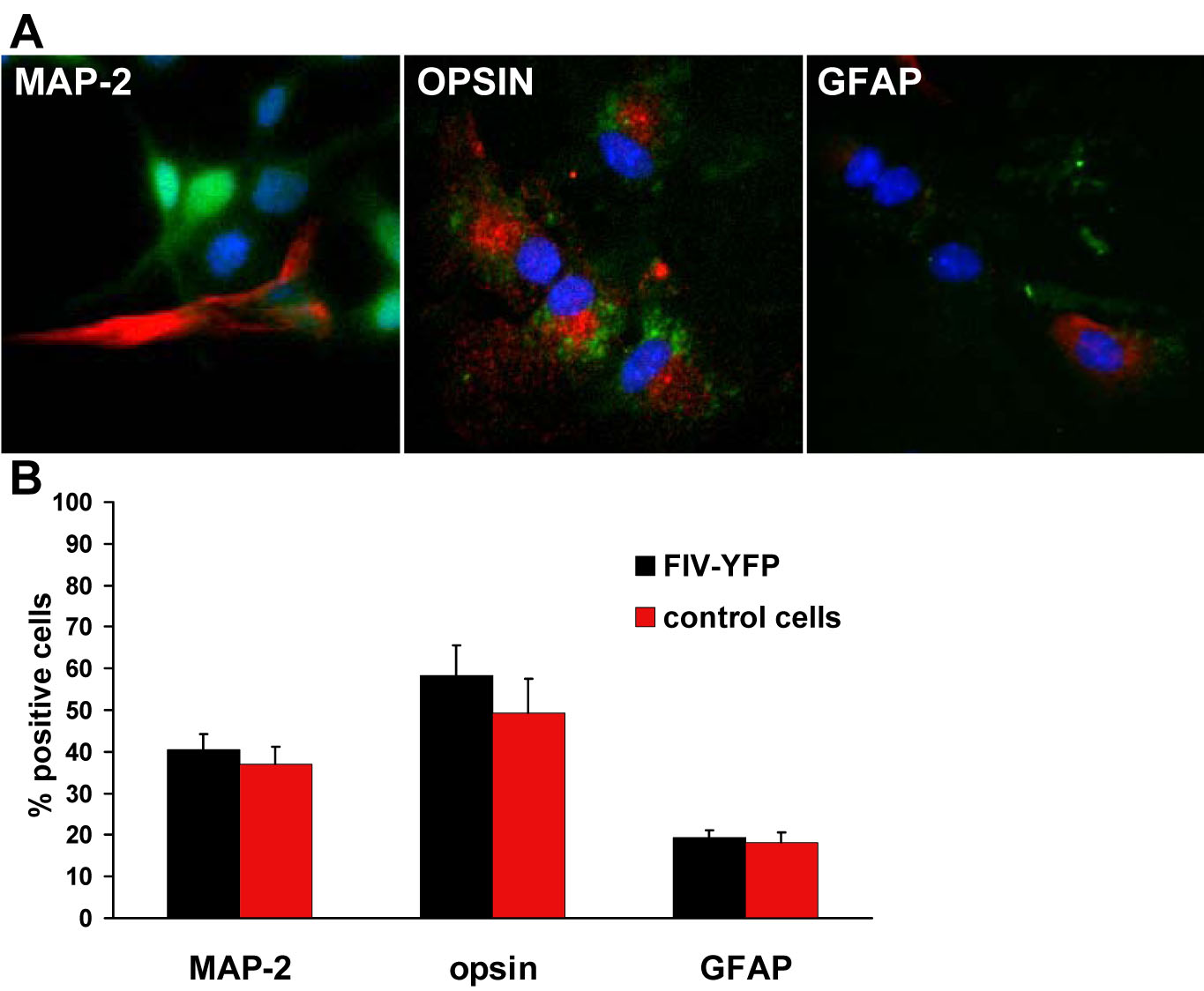 confocal microscopy, and signaling displayed in red. Green signal was YFP, and blue signal was DAPI staining for nuclei. B: Quantitative analysis of cells positive for MAP-2, opsin, and GFAP in RPC group infected with or without FIV-YFP. At least