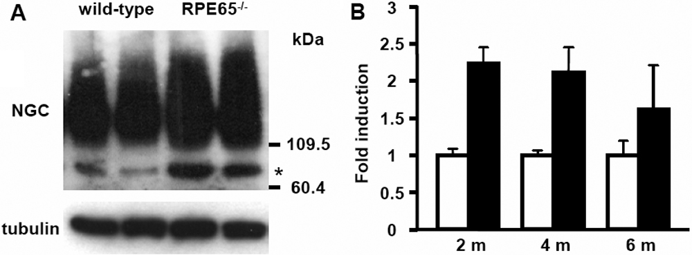 kDa. B: Total protein extracts were prepared from one retina of 2-, 4-, and 6-months (m)-old wild-type (white bars) and Rpe65-/-mice (black bars). NGC expression was assessed by western blot and subsequently quantified (n=3). The sum of NGC full-length