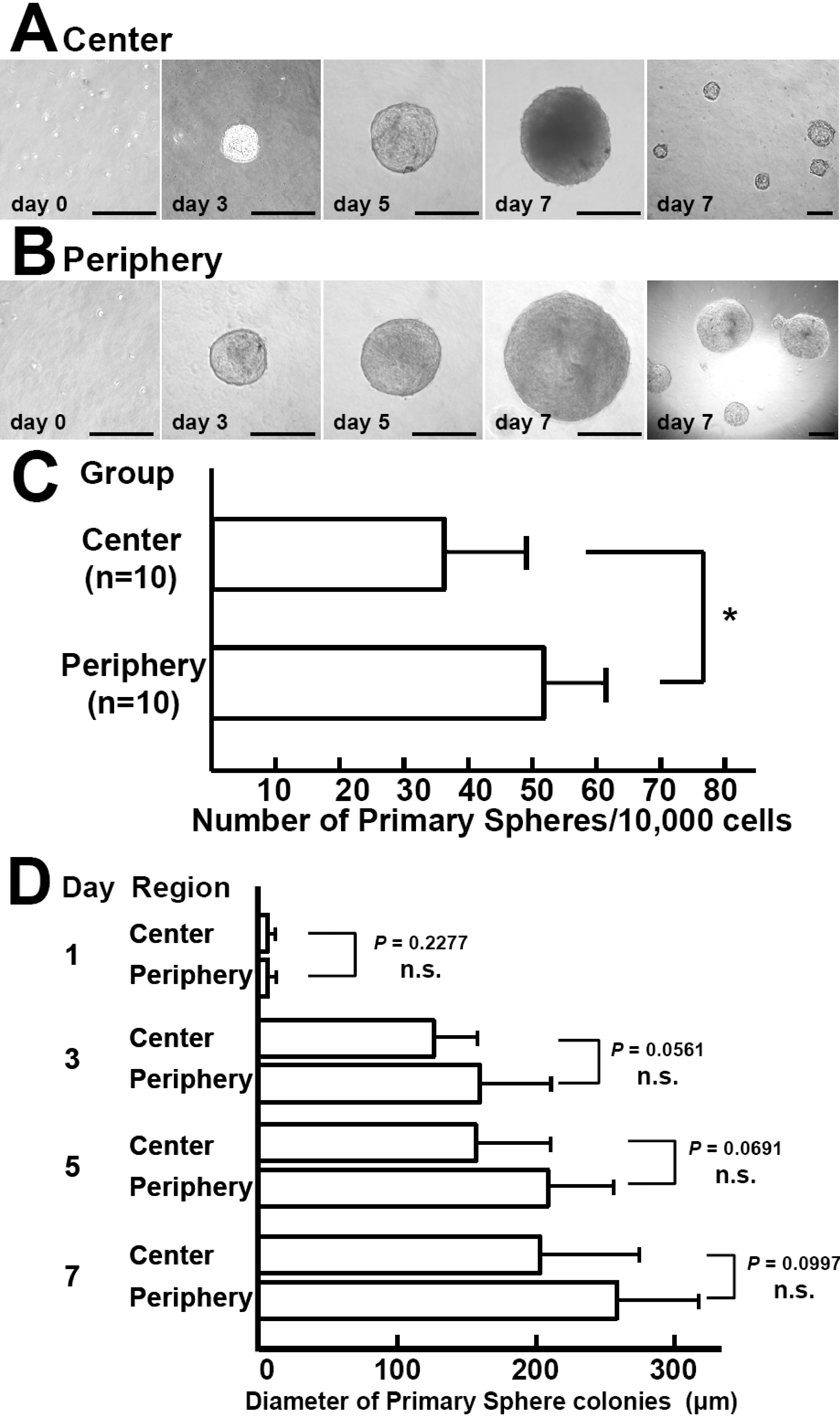 spheres from both regions gradually increased during culture to exceed
