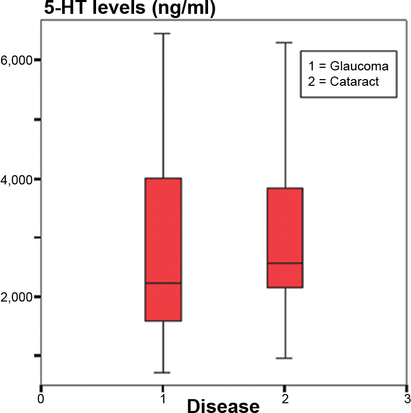 Serotonin levels. The chart shows lower levels of serotonin in aqueous humor of glaucoma patients than in aqueous humor of cataracts patients (2.838 ng/ml in GG and 3.076 ng/ml in CG; p=0.820).