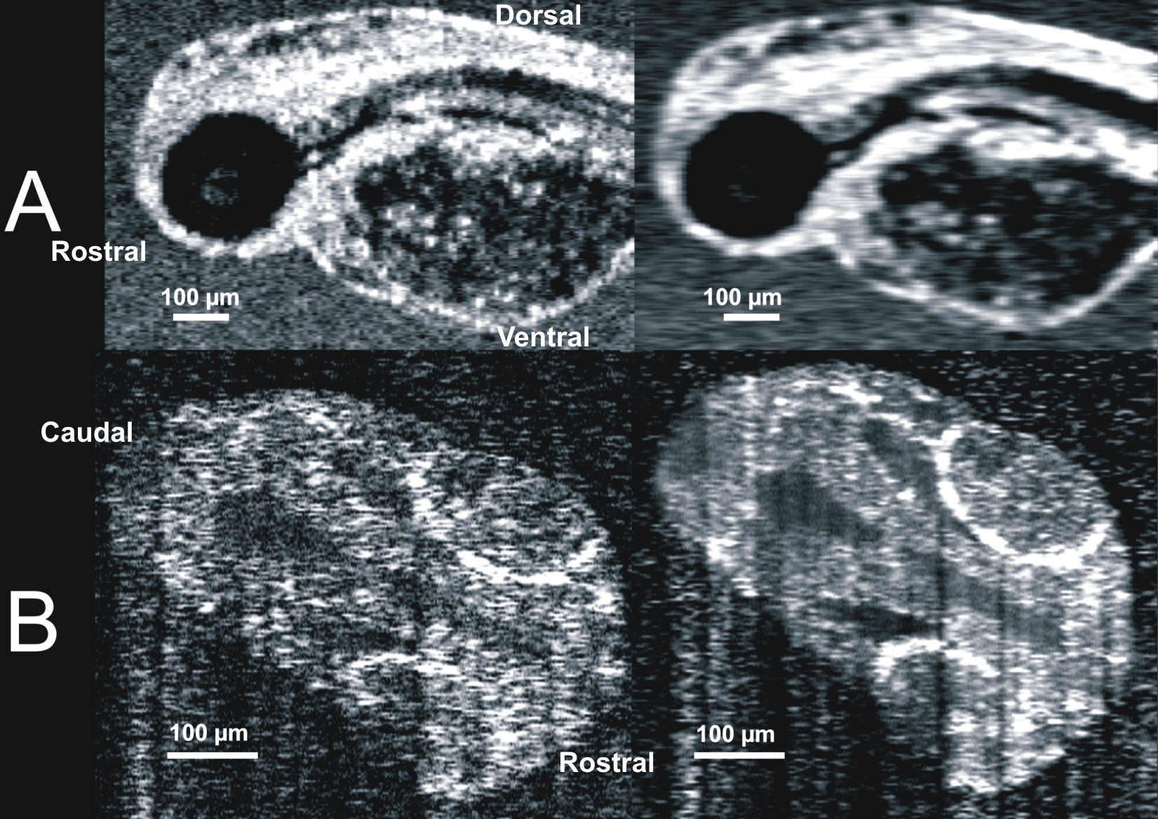 of a single frame and a 120 frame averaged within the brain of a 24 hpf