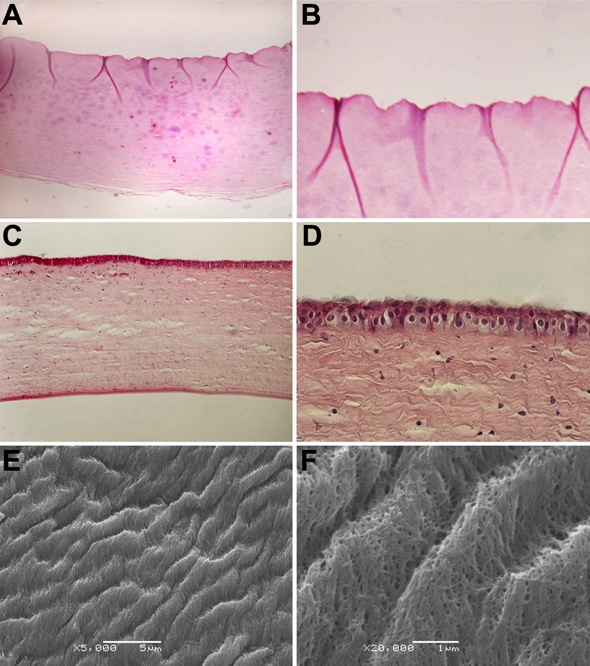 bundles, which were regular and parallel to the corneal surface (E; 5,000X) and (F; 20,000X). These were similar to the normal porcine cornea matrix.